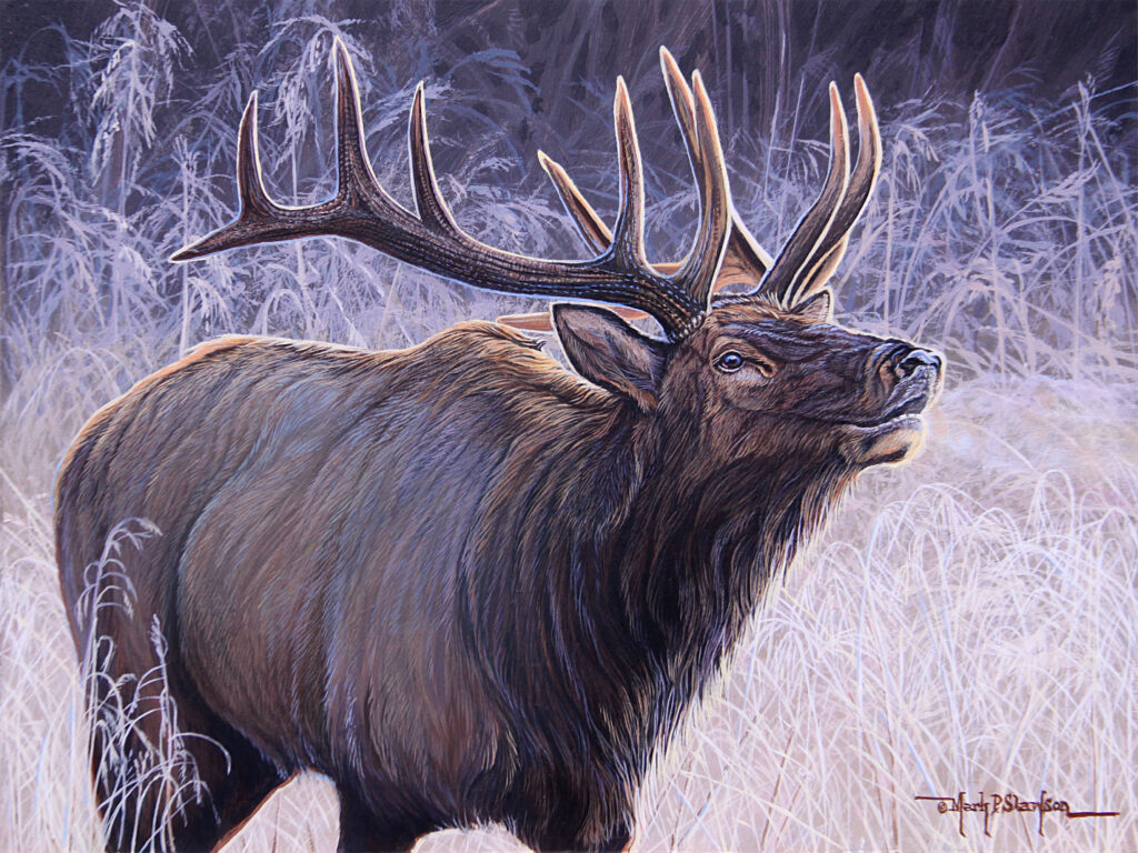 Acrylic painting on art board depicting early morning light spreading across a frost-covered field in Cherokee NC that lit up this good looking bull elk. Several encounters that day in the open field and along the river all contributed to an unforgettable and sometimes up close and personal experience with one North Carolina Elk herd restored to our state with help form The Rocky Mountain Elk Foundation.